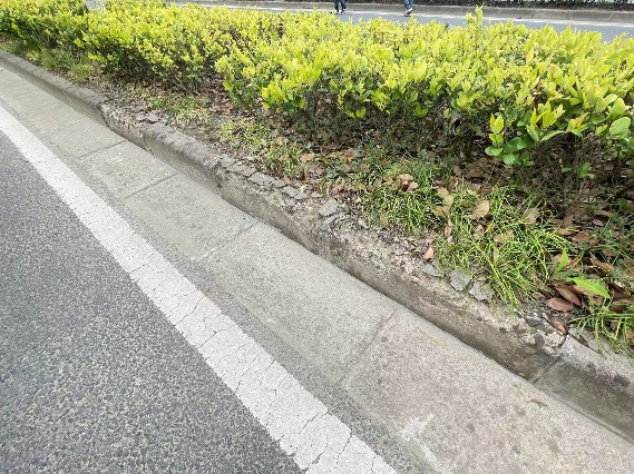 5、部分侧平石有倾斜、破损、隆起等现象,个别处旧砼侧平石风化严重。